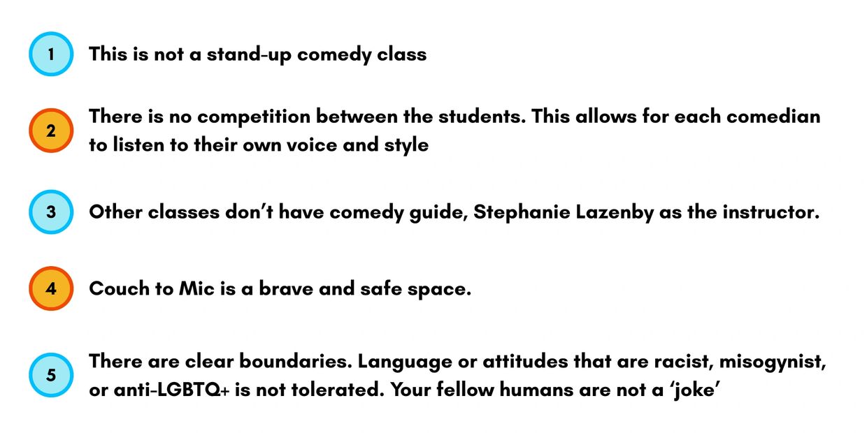 At its core, Couch to Mic™ is about discovering your authentic voice and connecting with other people. Those simple guidelines create the space in you to overcome fears, be vulnerable and to empathize with your fellow humans. Yes - a comedy workshop does all of that, when it’s under the guidance and skill of Stephanie Lazenby.